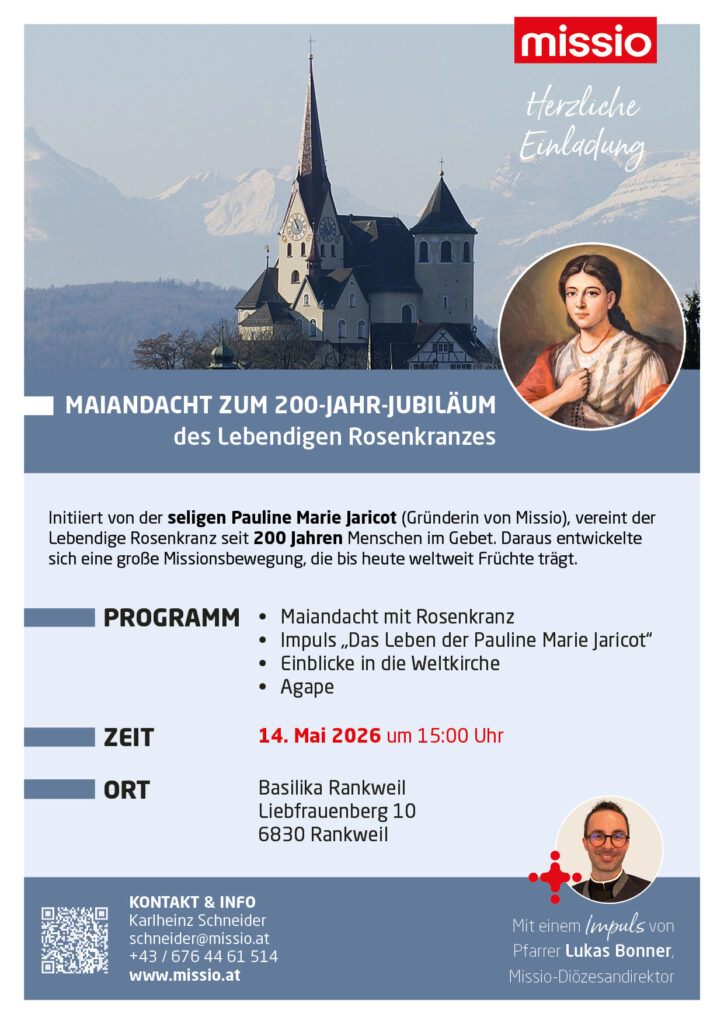 Zum Jubiläum „200 Jahre Lebendiger Rosenkranz“ lädt die Diözesandirektion Vorarlberg von Missio Österreich herzlich zu einer feierlichen Maiandacht in die Basilika Rankweil (Pfarr- und Wallfahrtskirche auf dem Liebfrauenberg) ein. Seit 200 Jahren vereint der Lebendige Rosenkranz Menschen im Gebet. Daraus entwickelte sich eine große Missionsbewegung, die bis heute weltweit Früchte trägt.
